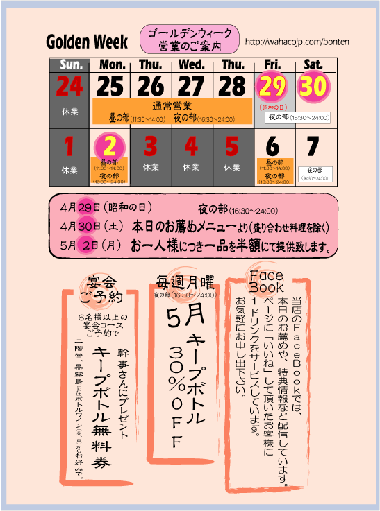 (5月2日の月曜日は昼の部・夜の部共に通常営業になります。)