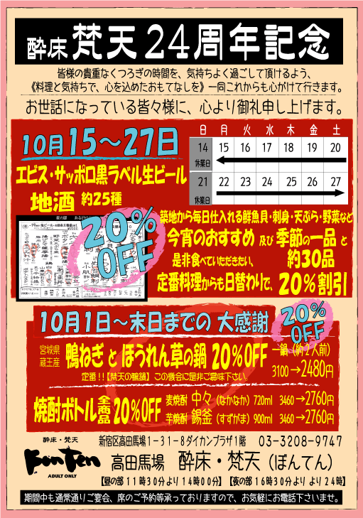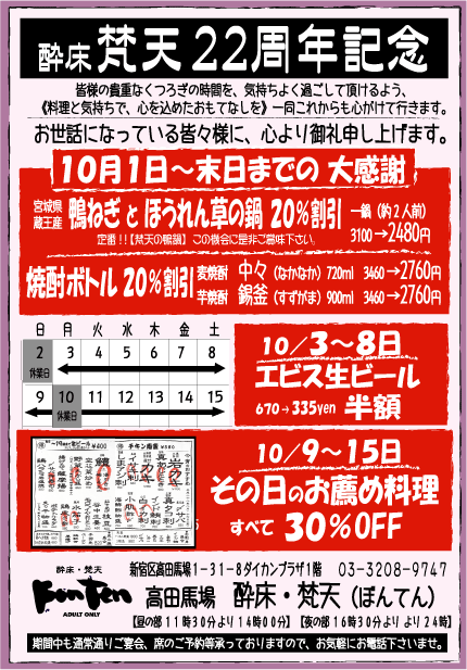 9月営業日のご案内(SilberWeek) 21日 敬老の日と22日(祝日)は誠に勝手ながら休業です。9月20日(日曜)23日(水曜 秋分の日)の両日は16時30分から営業いたします。23日は祝日ですが築地市場も開市ですので、新鮮な魚貝類をご用意してお待ちしています。尚、両日はキープボトル全品20%割引、鍋料理ご利用のお客様には、鍋用お食事セット(ご飯、漬け物盛り合わせ、地鶏玉子)をサービスいたしますので、是非 休日の少々お早い時間から【高田馬場 酔床 梵天】でゆっくりくつろいでいただければと思います。