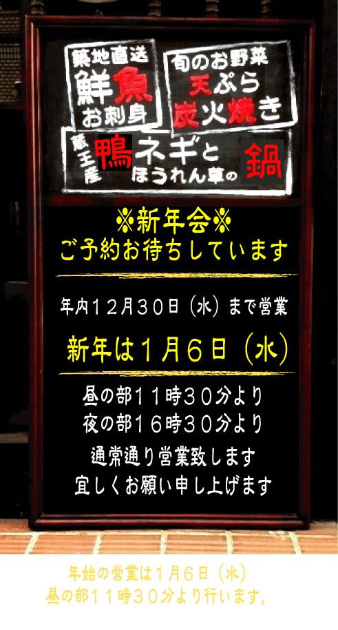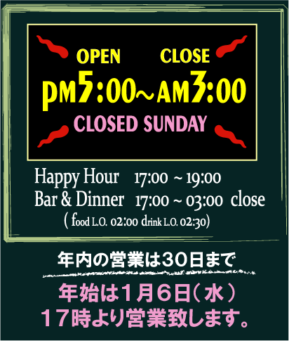 年内30日まで営業致します。年始1月5日(木)夜の部16:30より営業します。