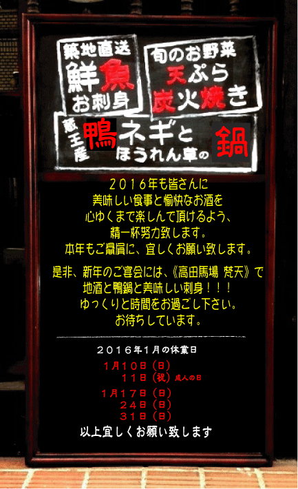 2015年も年の瀬、梵天、ガーリックチップスとも明日30日が年内最終営業日です。お寒いですが、どうぞ高田馬場『梵天』『ガーリックチップス』へお越し下さいませ。なお、新年は両店共に1月6日(水曜)より通常営業致します。 詳しくはコチラ
