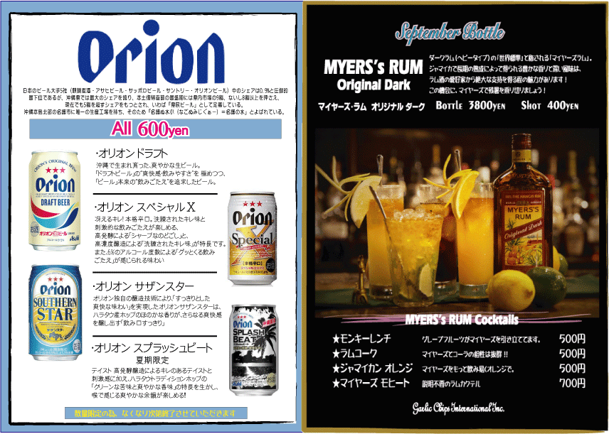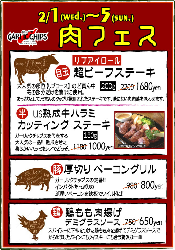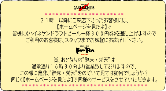 7月19日(日曜)は夜の部のみ16時30分より営業です。休日だけのサービスもございますので是非お立寄り下さいませ。尚、翌20日(月曜)は海の日で祝日の為、休業いたします。【注】ガーリックチップスはこの7月より月曜定休となった為、7月20日(海の日)は両店ともに営業しておりませんのでご注意ください。