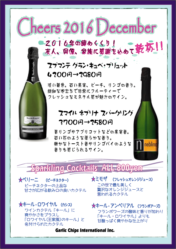 12月はなんと!月曜日もオープン!いつ来てもやってます!毎日やってます!年末の忙しさに負けないよう、ガーリックで楽しく過ごしましょう♪