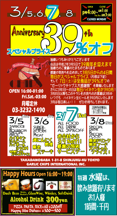 38周年期間は大盛況のうちに終了致しました!これからの1年も全力で愉快に営業してまいります!39年目のガーリックチップスを、よろしくお願いします!!