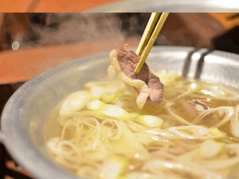だしが煮えたら、まずは長ネギをお皿から半分入れます。やや火の入ったところを見計らい、脂のたっぷり付いた鴨をお皿から半分、大胆につっこみ、あまり煮えすぎないうちに喰いたいらげます。後半分も同じように。