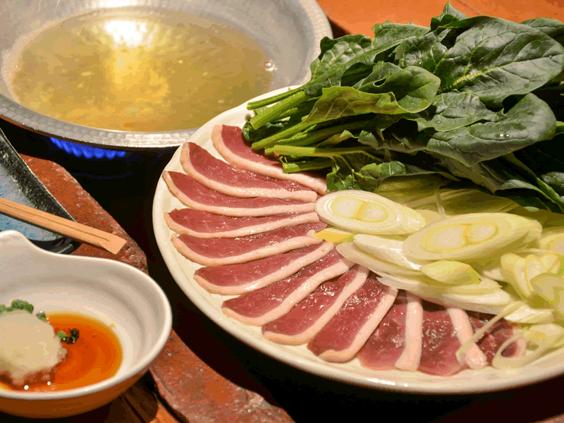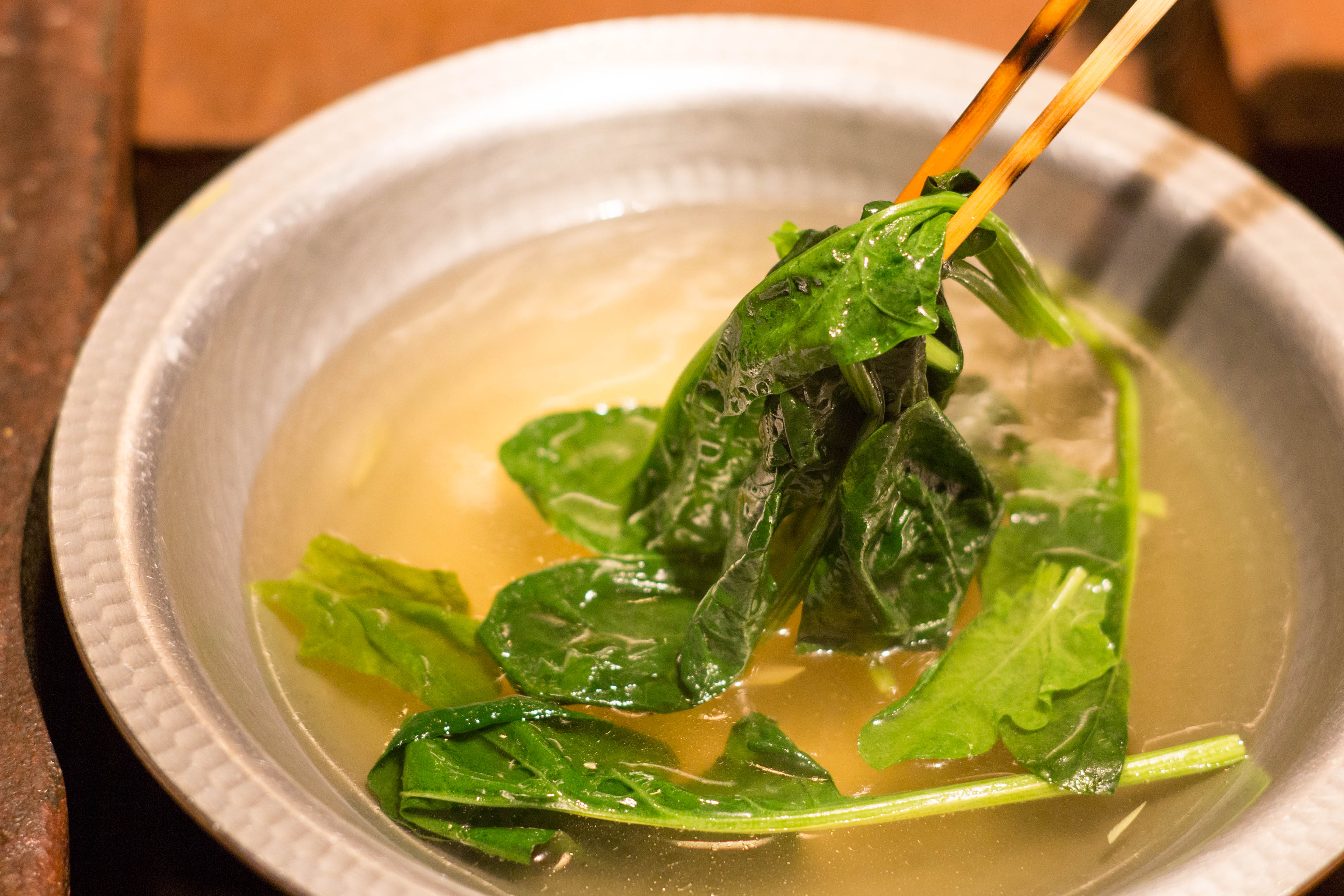 鴨とネギを充分に堪能したら、そこにすかさずホウレン草、さっと食べるとそこは天国。ビタミンA,B,Cと鉄分たっぷり含んだホウレン草に善玉コレステロールがのった味はサイコーです。納得のゆくうまさに仲間との会話もはずむこと請け合い。